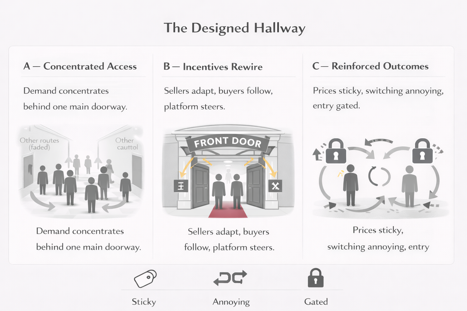 Now that we have a simple definition of competition, pressure on price and quality, easy switching, credible entry, we can look at the repeatable ways that pressure gets softened in modern platform markets. The patterns below are refer to incentives playing out in predictable ways once one doorway becomes more important than the rest. A seller who depends on a single demand funnel becomes cautious, a buyer who is busy follows defaults, a platform that controls the map can steer outcomes without shouting.